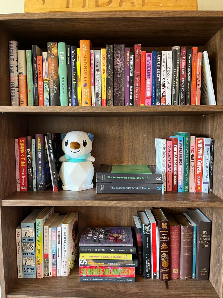 My bookshelves are primarily organized by topic, then ordered by time period and commonality. My section of transfeminine literature is the only place where there’s any alphabetical organization on the whole bookcase! The top shelf and the books to the left of Oshapott is my collection of all the transfeminine novels that I’ve already read (my TBR lives under my bedside table). On the other side of Oshapott, we’ve got my theory books, including the first two volumes of the Transgender Studies Reader stacked on their side for the aesthetic. On the third shelf, we’ve got my collection of trans memoirs, then my small collection of fiction from non-transfemme trans people to top it all off.