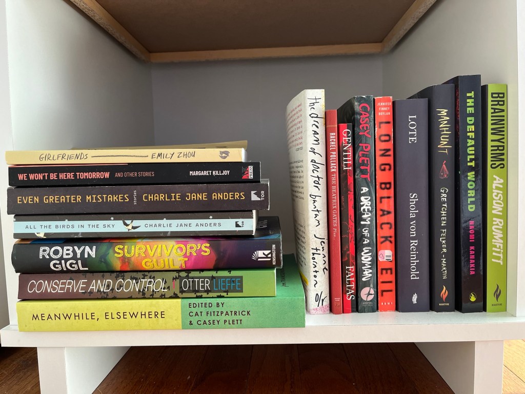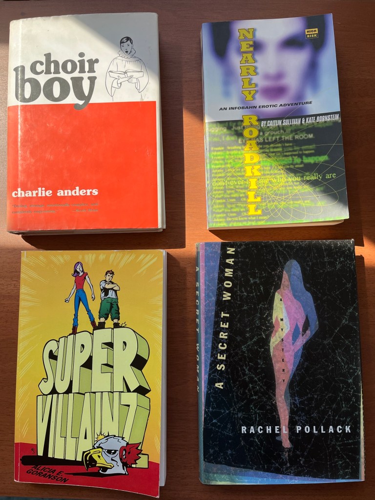 Four of my books by transfemmes are out of print and rather hard to track down. A lot of the fiction published in the 90s and 00s never got a Kindle edition, which means it’s only possible to read them if you can track a copy down. All four of these were ordered online through second-hand booksellers like AbeBooks. I’m super pleased to have a copy of all of these. Supervillainz is my personal favorite, but my friends seem to like Nearly Roadkill the best. I think they get a kick out of all the terrible sex scenes.
