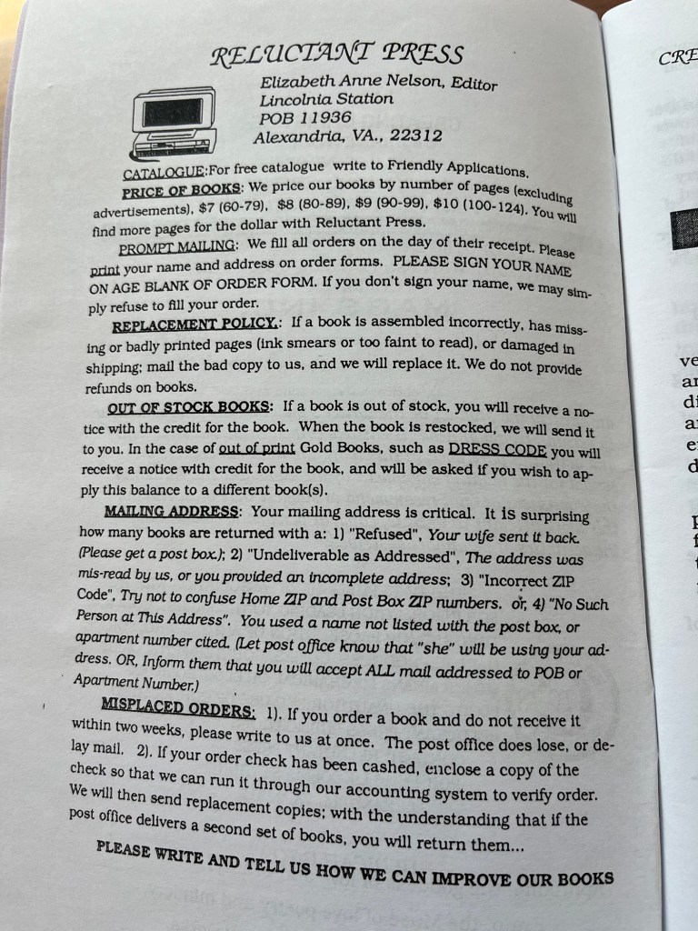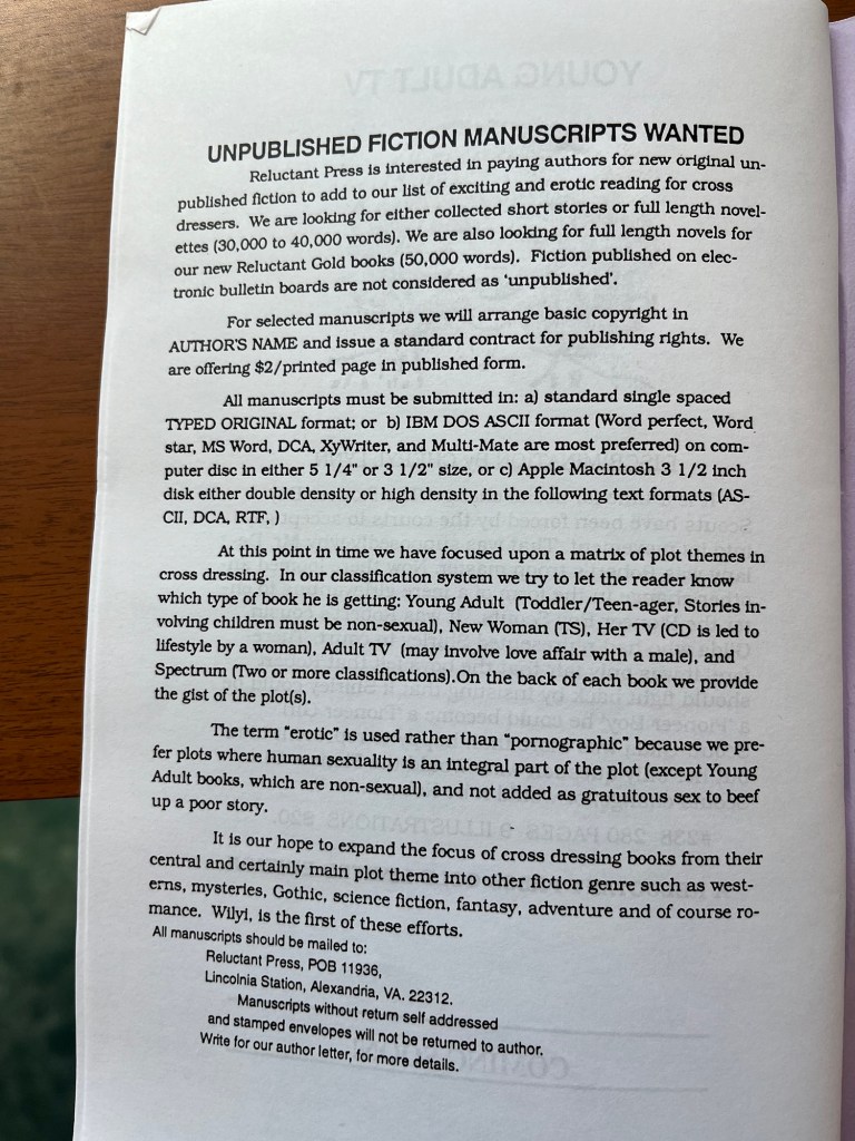 This is what a classic folio booklet from Reluctant Press looks like. If you were in with white cross-dresser circles in the second half of the 20th century, there was an entire underground industry dedicated to mail-ordering these booklets. You would get a catalog in the mail, check off the books you wanted, and send it back with cash. There are absolutely oodles of interesting little details in here – I’ll share the two pages that interest me the most: