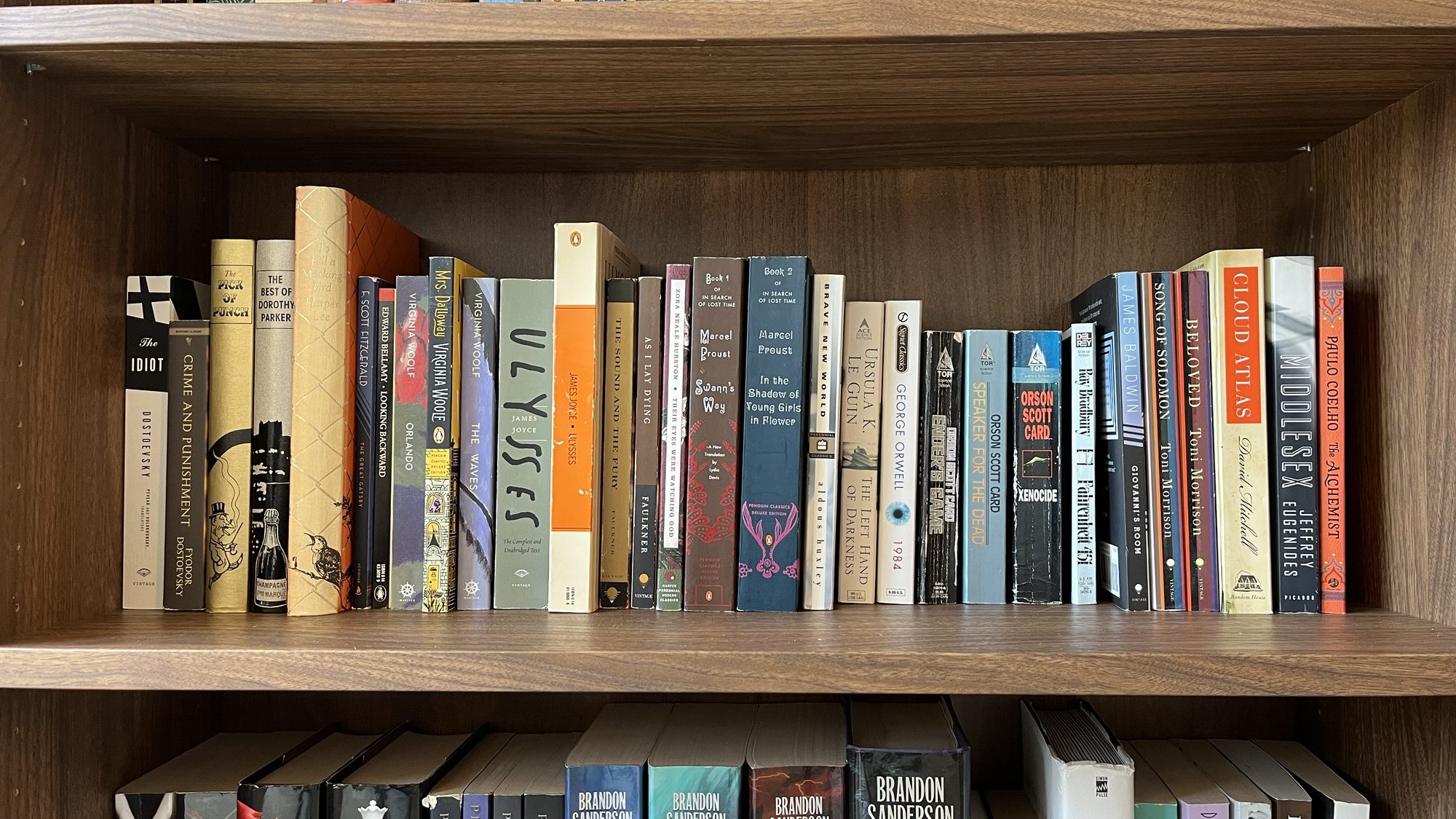 Okay, unlike the last few shelves, I don’t have any rare or interesting editions to talk about here. Just a solid collection of trade paperbacks and modern reprints for books I love (except you, Middlesex. I don’t like you. You’re here for the trans lit project and nothing else). Obviously Mrs. Dalloway is on this shelf as the last book rounding out my top five classics. I’ve got my modernist books (Woolf, Joyce, Proust, Faulkner), my black literary classics (Morrison, Hurston, Baldwin), my classic science fiction (Orwell, Huxley, Le Guin, Bradbury, Card), and the odd other favorite like The Alchemist by Paulo Coelho and Cloud Atlas by David Mitchell.