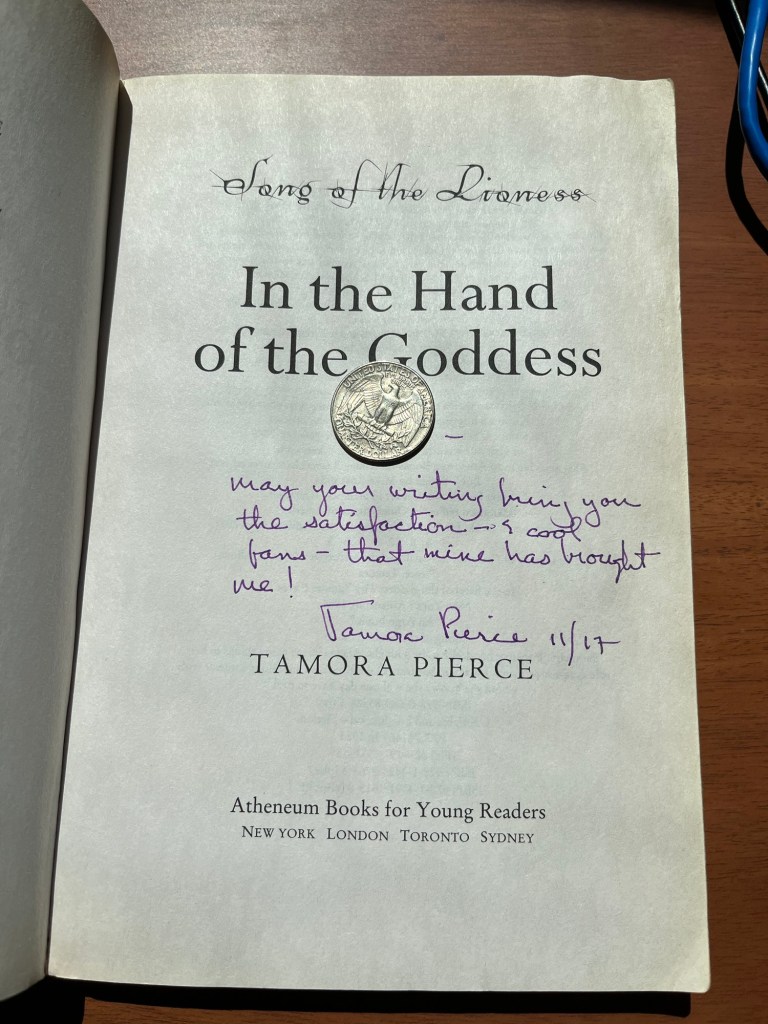 I’ve gone to see Tamora Piece speak twice, and my copy of In the Hand of the Goddess is actually signed by her (don’t mind the quarter over the deadname lol):