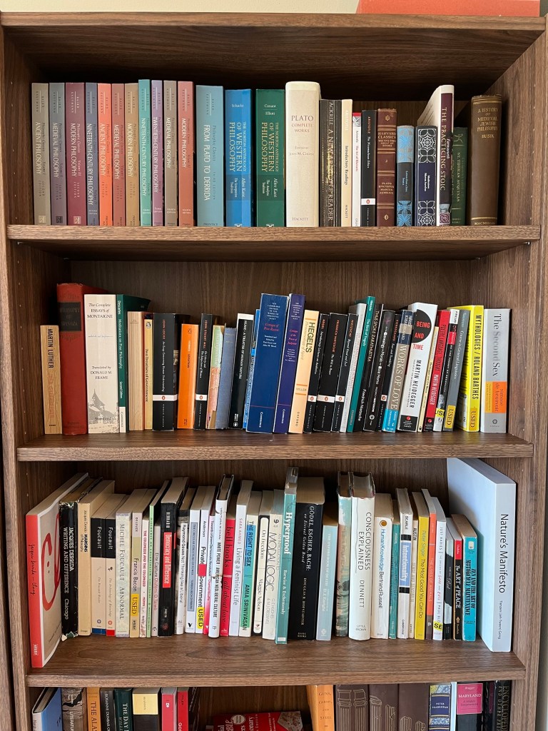 Okay, here’s where we lay my cards on the table lol. This an incomplete but fairly thorough cross-section of what my academic background in philosophy looks like. My read rate here is probably closer to 70% than 90% – one of my professors retired while I was graduating, and she offered me the pick of her bookshelves. I was very much not shy about filling out the gaps in my collection. That ridiculous stack of omnibuses in the top left corner (some of which are duplicate editions of the same book) all came from her. But you would probably be surprised how much of this I picked up and read on my own time. There are a couple texts here of particular note, so I’ll give you a brief tour of my favorites: