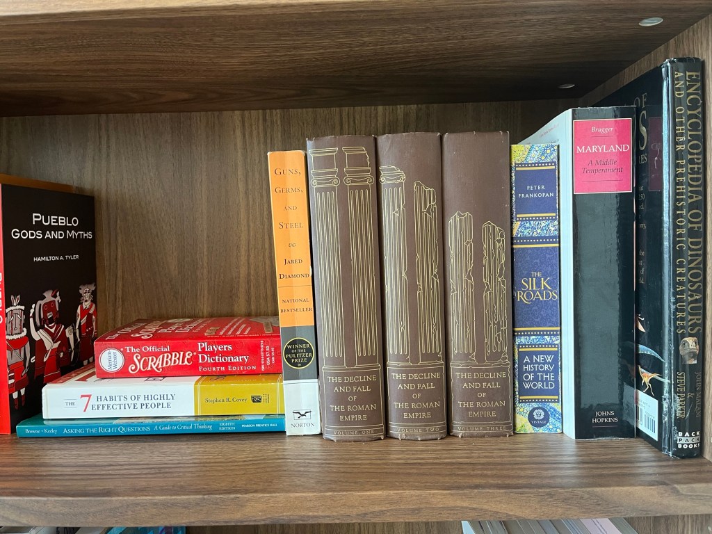 On the other side of that shelf, we’ve got some general non-fiction that didn’t really fit anywhere else. Most of it is history, including my three-volume set of The Decline and Fall of the Roman Emperor that I also got at The Unicorn Bookstore, but there’s also my Scrabble dictionary and my dinosaur encyclopedia (you never know when you’re gonna need your dinosaur encyclopedia).