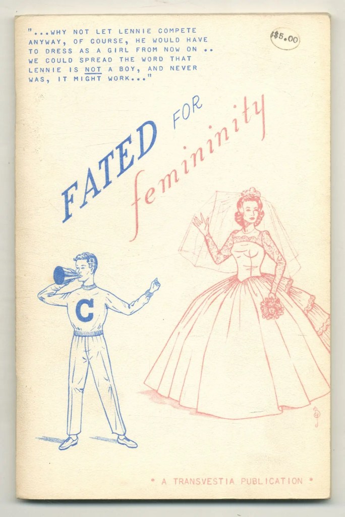 Virginia Prince would publish a significant body of fiction over her two decades at the helm of the press, including a giant wad of short stories and a number of novellas, many of which can still be found for sale today. The novellas were sanitized and prudish compared to their Petticoating ancestors, but they carried a distinct style and thematic presence that can still be seen in modern Transition Fantasy fiction today. Among them, notable titles include 1960’s Fated for Feminity for its fantasia of open and t4t relationships and 1965’s Double Switch for its depiction of both transfemmes and transmascs. Also notable was the adoption of an anonymous model of publishing that also persists in online circles to our modern day, though whether that arose out of safety concerns or Prince’s exploitation of Lawrence’s organizing work and unnamed trans authors, we may never know.