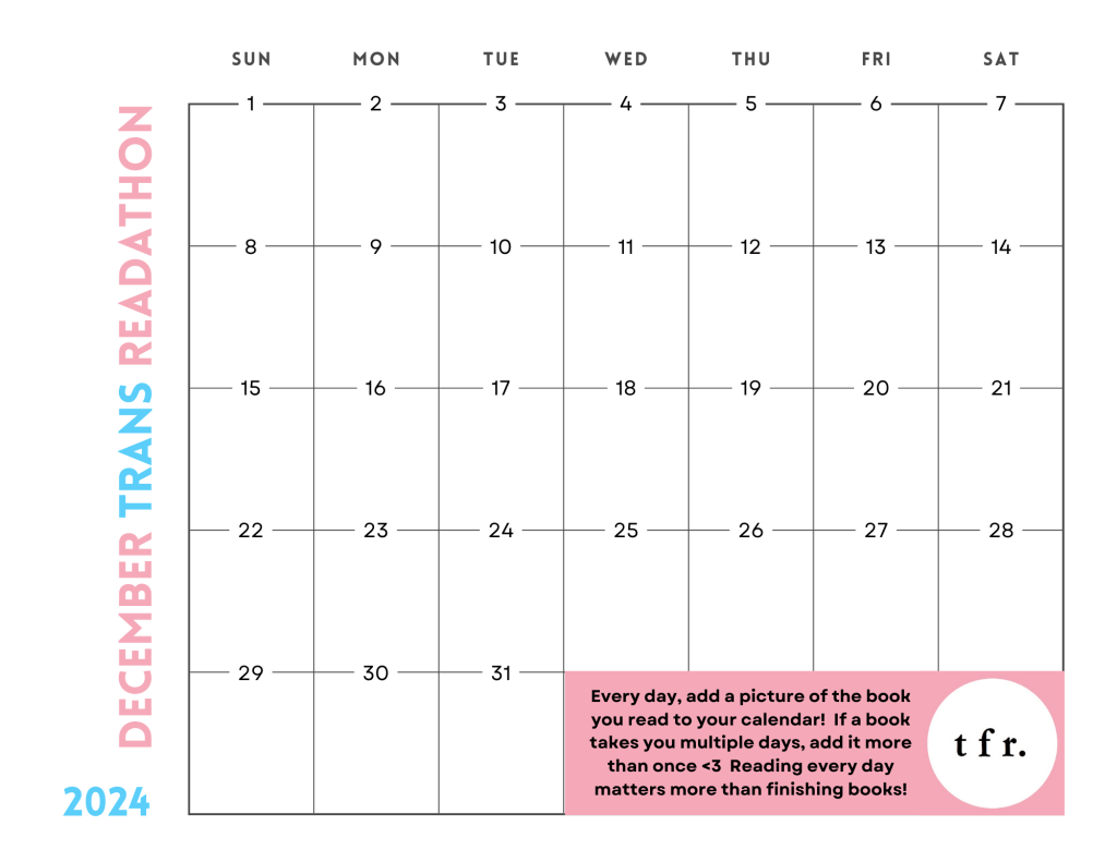 If you’ve been paying attention to my Bluesky, then you may know that I’ve created a fun reading challenge for the month of December! The goal of the December Trans Readathon is to read a trans book every day – whether that’s the same book for thirty-one days or thirty-one books on the month is completely up to you. Every day you read a trans book, you can add a picture of its cover to its day on our #DecemberTransReadathon calendar: