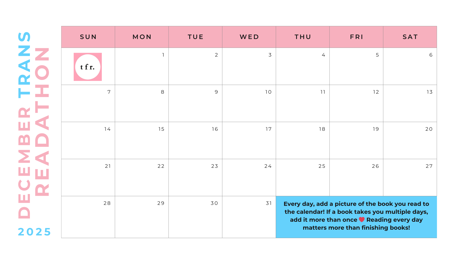 Do you want a fun reading challenge this month? The December Trans Readathon is our community’s effort to read trans books every day during awards season! It doesn’t matter what books you choose or how many of them you finish – as long as you’re reading trans authors, we would love to read alongside you :)) Add a picture of the book you read to your calendar each day as you go! Post your progress on social media with #DecemberTransReadathon, and make sure to tag us on Bluesky and Tumblr.
